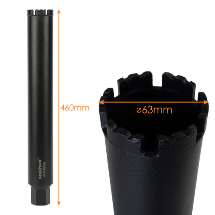 De Bigstren Bigstretch diamant boorkroon 63×450 mm is ontworpen voor professionele, snelle en nauwkeurige kernboringen in extreem harde materialen. Dankzij de hoogwaardige diamantsegmenten boor je moeiteloos in beton, gewapend beton, asfalt, natuursteen, gres en graniet – met strakke randen en minimale afbrokkeling.